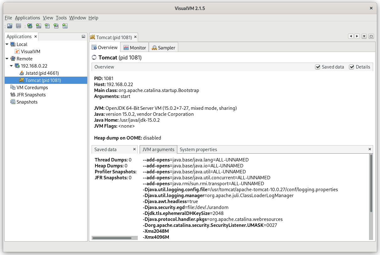 sudo -u tomcat /usr/java/jdk-15.0.2/bin/jstatd -J-Djava.net.preferIPv4Stack=true -J-Djava.rmi.server.logCalls=true -p 1099 -r 1100