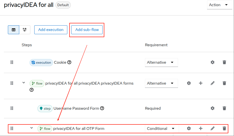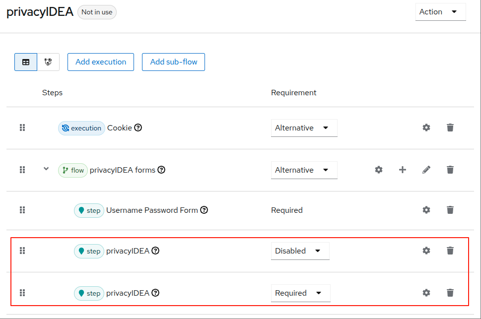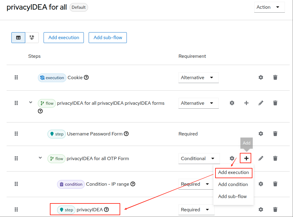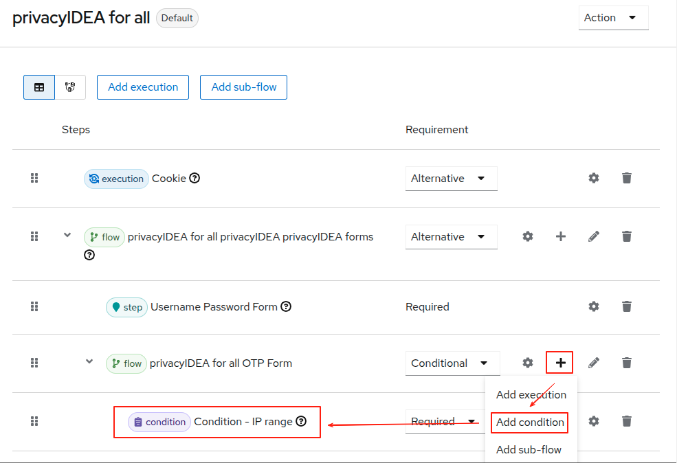 因此,如果需要添加条件认证,以上圈红部分的OTP执行流程(step privacyIDEA)你需要先删除。